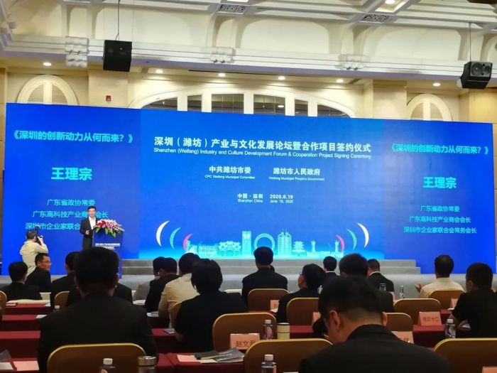 2020年6月19日,由濰坊市委市政府主辦的“深圳(濰坊)產(chǎn)業(yè)與文化發(fā)展論壇暨合作項(xiàng)目簽約儀式”在華僑城洲際酒店隆重舉行,理宗會長受邀出席并做題《深圳發(fā)展的創(chuàng)新動力從何而來》的演講,我會海王集團(tuán),深圳市捷順科技實(shí)業(yè)股份有限公司、深圳市華科創(chuàng)智有限公司等會長、副會長單位也出席活動并做分享。濰坊市委書記惠新安攜濰坊市各局,各縣市區(qū)、市屬開發(fā)區(qū)主要負(fù)責(zé)人共出席了此次活動,會議由濰坊市委常委,宣傳部部長初寶杰主持。