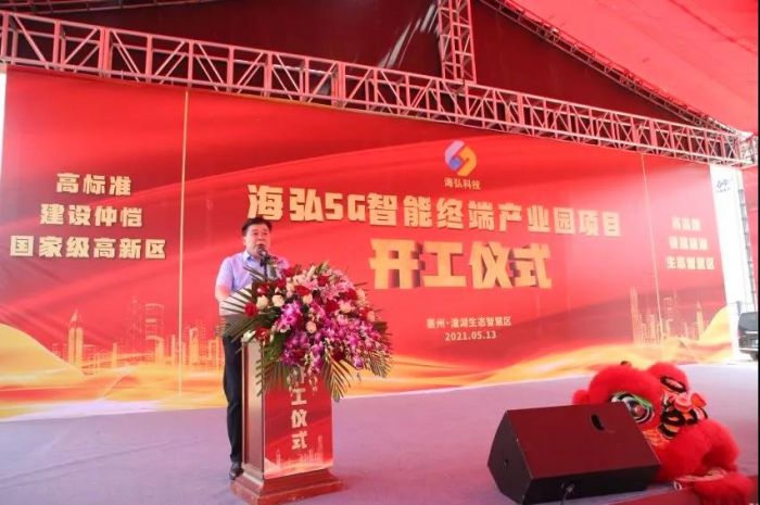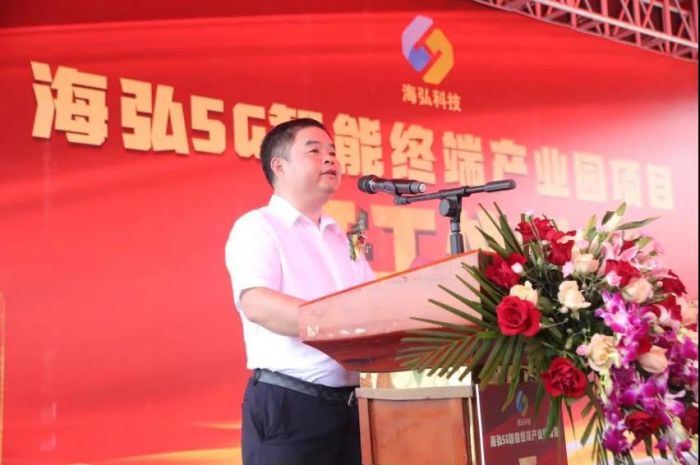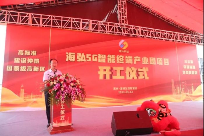 惠州潼湖生態智慧區管委會專職副主任胡小華在致辭時表示,海弘5G智能終端產業園項目致力于研發生產5G智能移動終端產品,項目建設單位實力強,項目科技含量高。項目建成投產后將為仲愷高新區和潼湖生態智慧區打造5G智能終端產業集群起到補鏈強鏈鍛鏈重要作用,也將為惠州市打造萬億級電子信息產業集群貢獻力量。